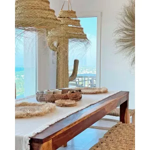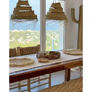 DIÁMETRO: 40 CM | ALTO: 35 CM | ALTO CON FLECOS: 40 CM APROX. MATERIAL PRINCIPAL: ESPARTO